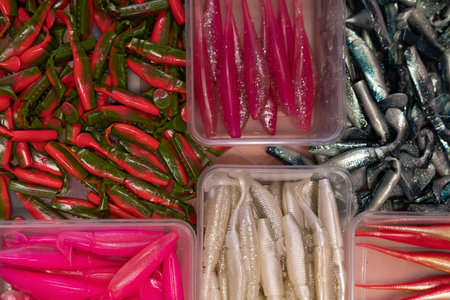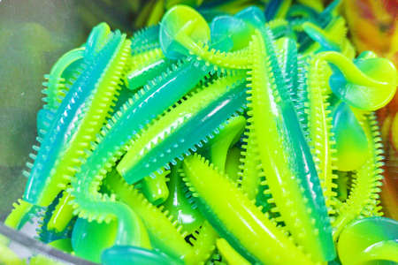 Fishing lure. Silicone shelf in store. Boat fish gear. Colorful plastic worm