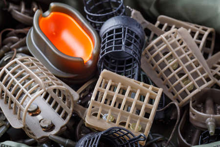 Fishing feeder and reel.fishing tackle gear box.close up of classic fishing feeder case.Fishing tackle background.
