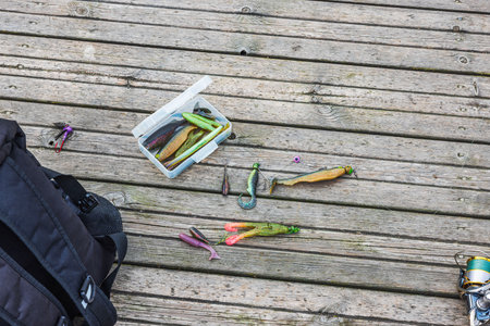 Close up view of fishing lures and tackle box with soft baits lie on wooden pier beside backpack and spinning reel. Sweden.