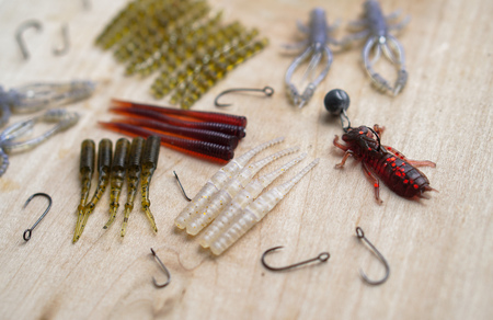 A set of fishing lures made of silicone. Bait for fishing. Fishermans equipment. Selective focus