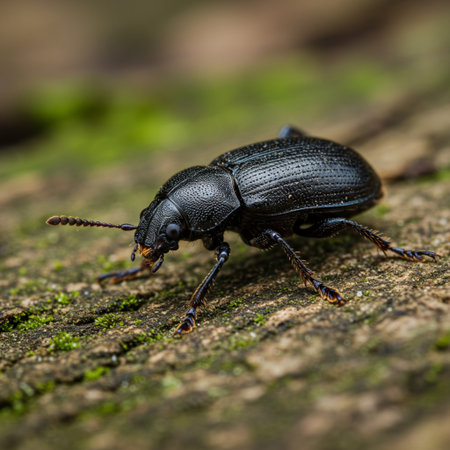 A detailed view of a beetle crawling on a tree bark, highlighting its shiny shell and the rough texture of the wood in the background