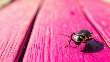 This macro shot captures a colorful beetle as it crawls over a vibrant pink wooden surface, showcasing intricate details under natural light.