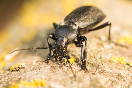 Macro of longhorn beetle, Prionus coriarius on violet blossom flower