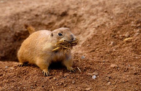 A priairie dog with a mouthful of nesting material
