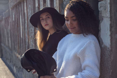 Portrait of a pair of beautiful fashionable Spanish girls standing against a texture wall.