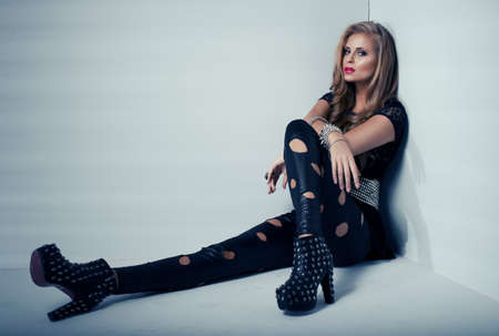 Sexy woman in black clothes in dark room