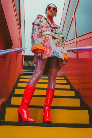 Fashion portrait of a beautiful woman in colorful clothes and red boots
