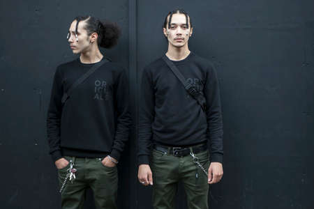 LONDON, ENGLAND - September 15, 2017 Beautiful and stylish twins boys in black shirt and jeans posing during the London Fashion Week. outside Eudon Choi