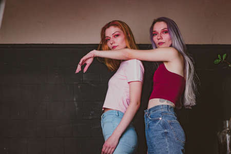 Glamour makeup two women with long hair style sitting on street wall background in dark. Fashion color portrait