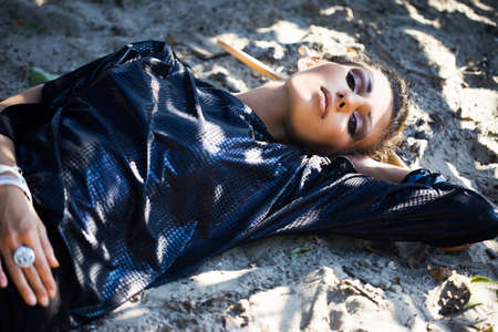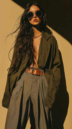 Fashion beauty portrait of young woman with long hair in green organic suit on desert background