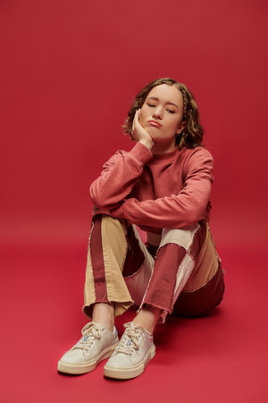 bored and stylish gen z girl in patchwork pants and cropped long sleeve sitting on red backdrop