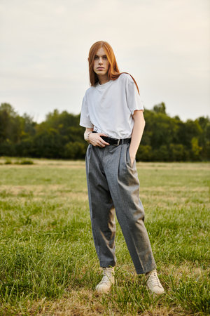 A young and stylish man with long hair stands confidently in a scenic field, exuding fashion flair.