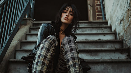 Young woman in leather jacket and plaid pants poses on outdoor stairs in urban setting