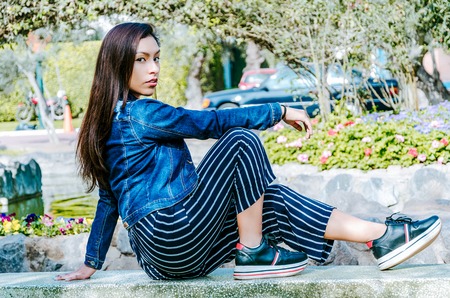 Outdoors lifestyle fashion portrait of pretty fashionable woman sitting on the marble bench. With an elegant wide jacket of jeans and black pants