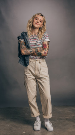 Confident young female tattoo artist smiles with crossed arms, showcasing her colorful body art in a professional studio setting