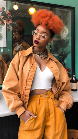 Beautiful african american woman with orange hair posing in cafe