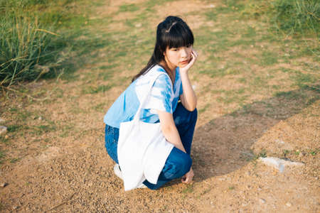 Black half tied hair girl in white and blue tie dye sitting in grassland with canvas bag.