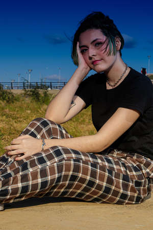 Alternative young girl with green hair in black shirt and checkered pants strolling down the street