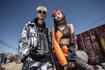 Two stylish individuals showcase their unique fashion choices in an industrial area under a clear blue sky. The vibrant colors of their outfits contrast with the dull surroundings.