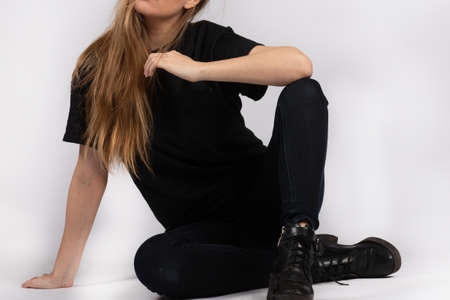 Woman or girl wearing black blank cotton t-shirt with space for your logo, mock up or design in casual urban style