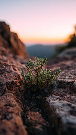 A close-up view presents a small plant emerging from rough, brown rock formations. The image showcases detailed textures and earthy tones, lit by a warm, soft sunlight, with an out-of-focus background. This image could be suitable for various uses, including environmental themes, or design projects.