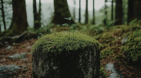 A moss-covered stump with a small green sprout growing from the top, surrounded by a forest.