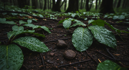 Ground level view of heavy raindrops falling. splashing raindrops background in the forest