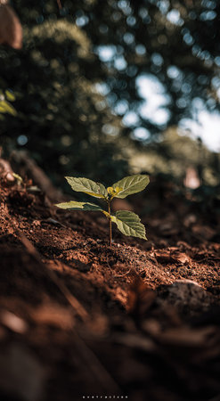 A close-up captures a small plant emerging from brown earth. Green leaves contrast against the earthy tones of the soil, with a blurred natural background. The image, with its shallow depth of field and soft lighting, could be suitable for environmental, educational, or illustrative purposes.