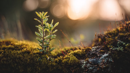 Photo of a young plant growing on moss at sunrise, symbolizing hope and new beginnings.