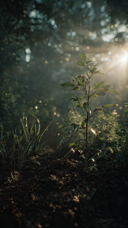 A cinematic wide shot of a young Huckleberry growing, slightly larger than before, its trunk and branches beginning to take shape, surrounded by rich, dark soil and faint morning mist, golden sunlight breaking through the clouds, soft beams illuminating the growing tree, ultra-realistic photography with true Earth like realism natural hues, no artificial colors, cinematic composition, deep 3D parallax depth creating an immersive, awe inspiring atmosphere, subtle natural lens flares, minimal 35mm film grain, tranquil and hopeful tone, 8K, highly detailed.