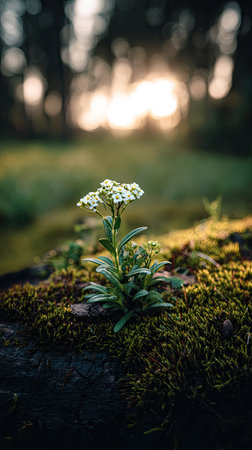 Photo of a young Sweet alyssum growing on moss at sunrise, symbolizing hope and new beginnings.