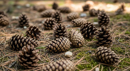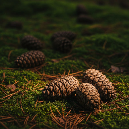 A serene close-up view of pine cones scattered on a soft forest floor, illuminated by gentle light filtering through trees, capturing nature
