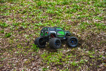 The car's large studded wheels were stuck in a mud puddle. High quality photo