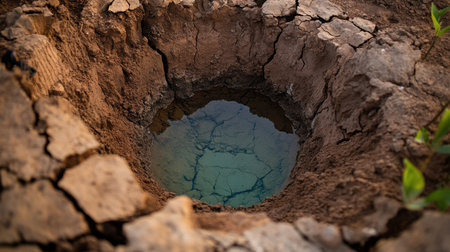 A Dried up well with cracked earth and stagnant water