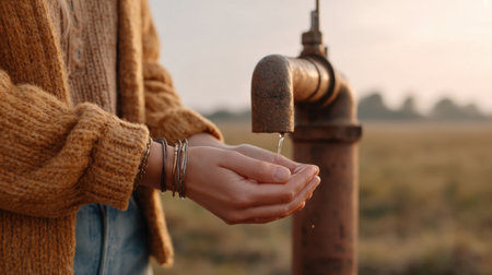 A peaceful scene showcasing a woman in a cozy sweater collecting clear water from a vintage pump in a serene field, capturing a tranquil moment in nature.