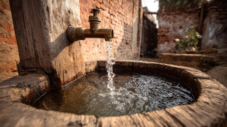 A close-up view presents water cascading from a metal faucet into a weathered stone basin. The scene, marked by rustic brickwork and a natural aesthetic, suggests an outdoor setting. The composition uses depth of field. The image may be suitable for projects illustrating resource management or environmental concerns.