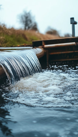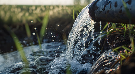Close-up of waste flowing from industrial pipes into a natural stream, highlighting environmental pollution