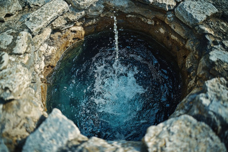 A detailed shot of a sacred well with shimmering water gently cascading, encircled by rugged stones, evoking tranquility and natural beauty.