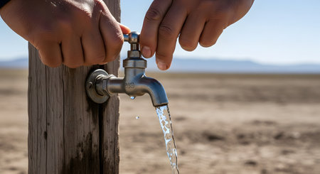A pair of hands opens a metal water spigot, releasing a stream of clean water onto the dry, cracked earth below. The background is a vast, arid landscape, highlighting the scarcity and preciousness of water. This powerful image symbolizes drought, water conservation, scarcity, and the vital importance of this resource.