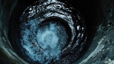 A mesmerizing view looking down into a deep well, revealing swirling water and dark stone walls. This image captures the essence of natural beauty and tranquility.