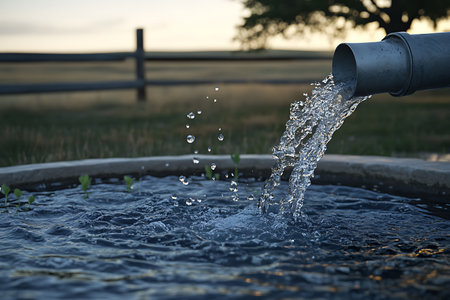 Water pours from an overhead white pipe into a stone trough, creating splashes and ripples on a sunlit day in a grassy field.