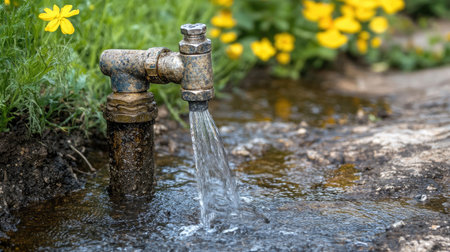 A rusty pipe pours water into a stone basin reminds us of the importance of water as a precious resource, and the need to conserve it