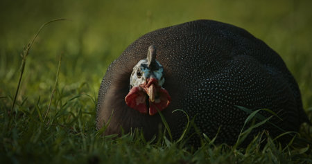 Helmeted guineafowl (Numida meleagris) on green meadow in Serengeti national park, Tanzania