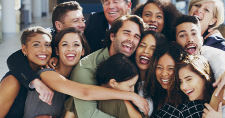 Friends, hug and excited with business people in office together for love, support or team building. Comic, diversity and portrait with employee group smile in company workplace for bonding joke