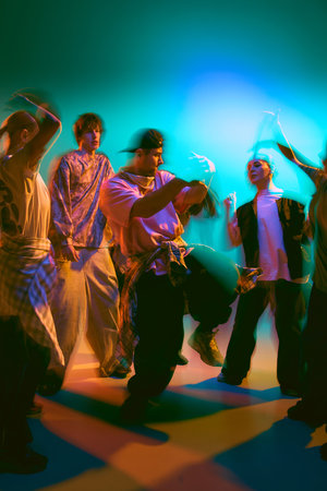 A diverse dance crew of young individuals express urban creativity energetically on a vibrant, multicolored stage. Concept of modern dance diversity and artistic expression.