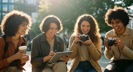 Four young people sitting outdoors, using tablets and cameras, smiling and enjoying a sunny day in a park.