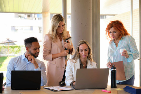 Group of young adult coworkers collaborating at shared desk with laptops and documents in modern creative coworking space