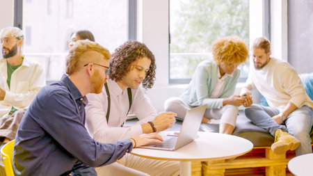Young entrepreneurs collaborating on a business idea in a modern office environment with laptops