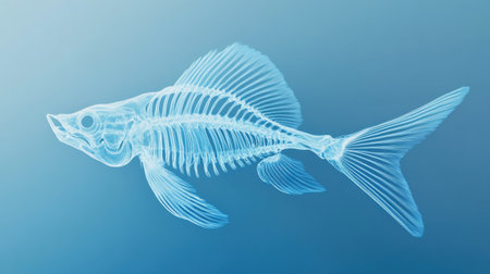 This stunning image showcases a transparent fish skeleton, revealing intricate bone structures against a soft blue background, perfect for educational and scientific projects.