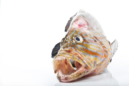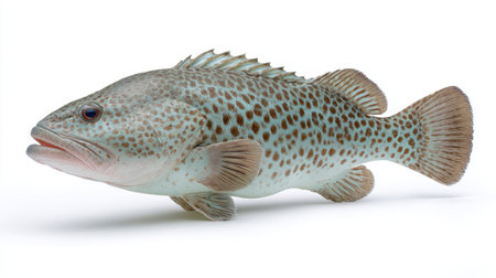 Freshly caught grouper fish isolated on white background. front view.